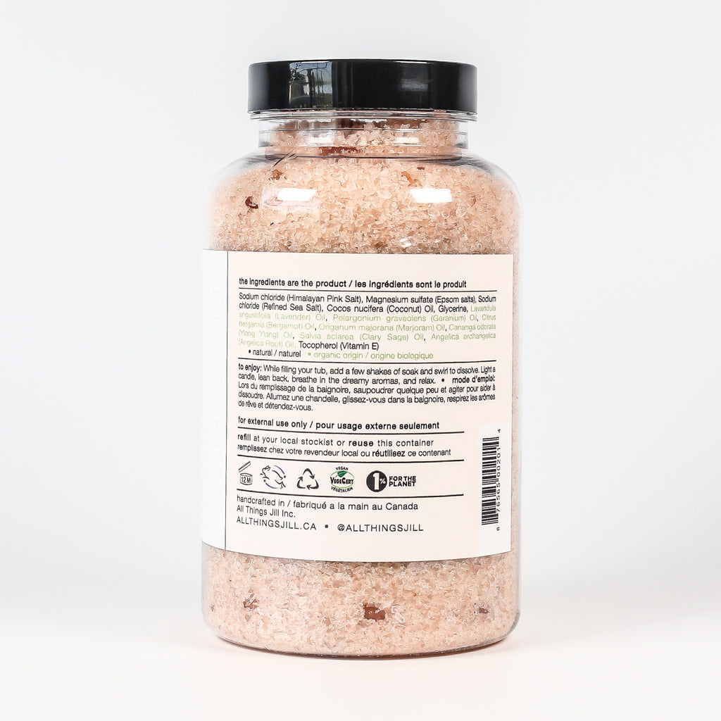 Sodium chloride (Himalayan Pink Salt), Magnesium sulfate (Epsom salts), Sodium chloride (Refined Sea Salt), Cocos nucifera (Coconut) Oil, Glycerine, Lavandula officinalis (Lavender) Oil, Pelargonium graveolens (Geranium) Oil, Citrus bergamia (Bergamot) Oil, Origanum majorana (Marjoram) Oil, Cananga odorata (Ylang Ylang) Oil, Salvia sclarea (Clary Sage) Oil, Angelica archangelica (Angelica Root) Oil, Tocopherol (Vitamin E)