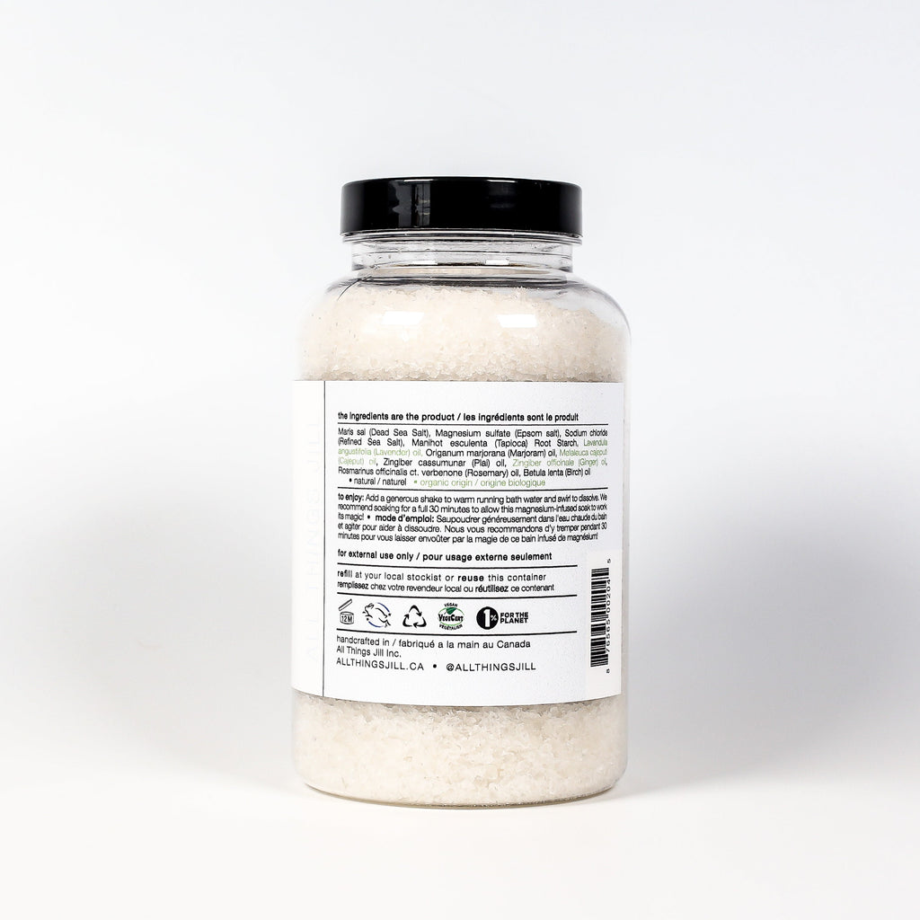 The answer to achey, fatigued post-workout muscles! Ample amounts of Dead Sea and Epsom salts soothe muscles and infuse your bath with magnesium sulfate. Combined with refined sea salt, this combo creates a silky bath that will melt away stress, tension and muscle fatigue. We’ve added therapeutic essential oils of lavender and rosemary to combat inflammation; ginger to help your body’s circulation kick out any lactic acid; birch to refresh body tissues; and marjoram to relax tense muscles and help calm your nervous system so you can heal faster.